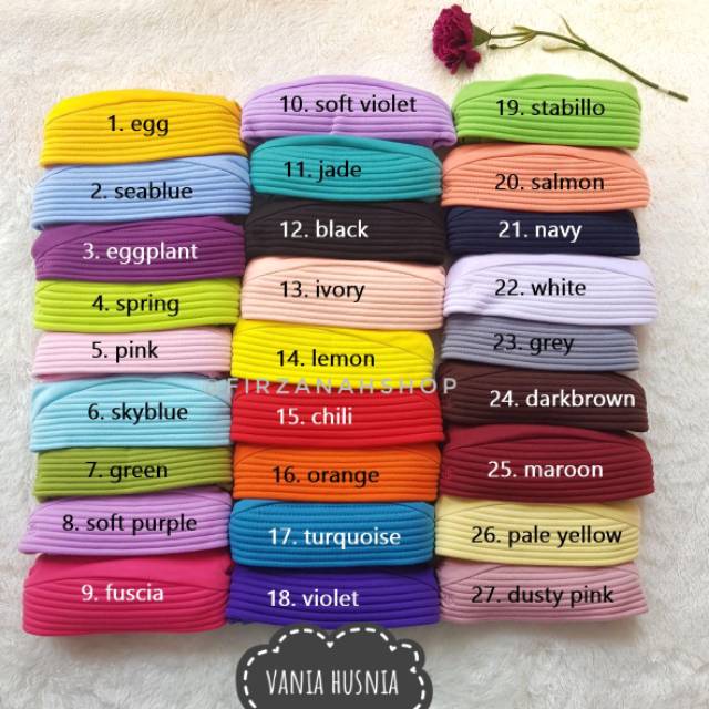 Produk ini memiliki 27 Variasi Warna yaitu : Egg,Sea Blue,Eggplant,Spring,Pink,Sky Blue,Green,Chili,Soft Purple,Fuscia,Soft Violet,Jade,Black,Ivory,Lemon,Orange,Turquoise,Violet,Stabillo,Salmon,Navy,White,Grey,Dark Brown,Maroon,Pale Yellow,Dusty Pink,