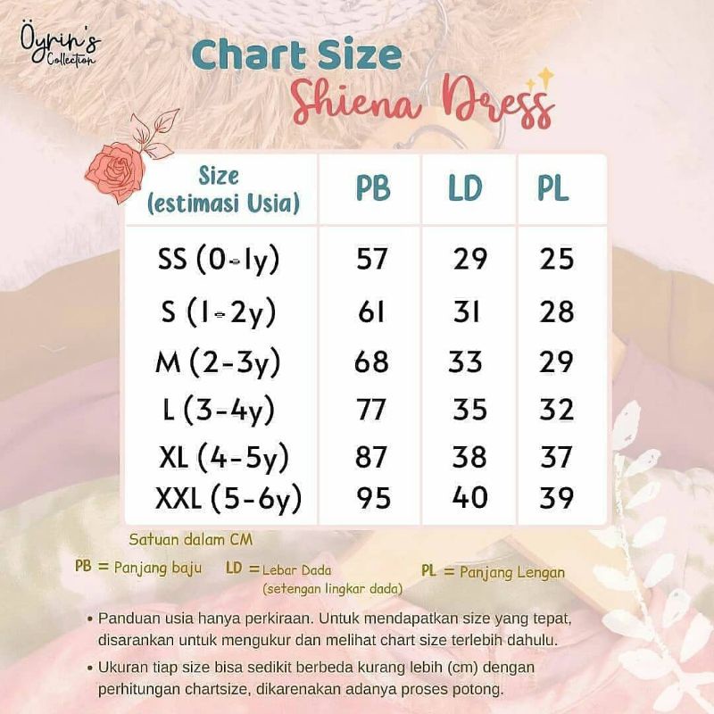 Produk ini memiliki 6 Variasi Ukuran yaitu : SS (3-12m),S (1-2y),M (2-3y),L (3-4y),XL (4-5y),XXL (5-6y),