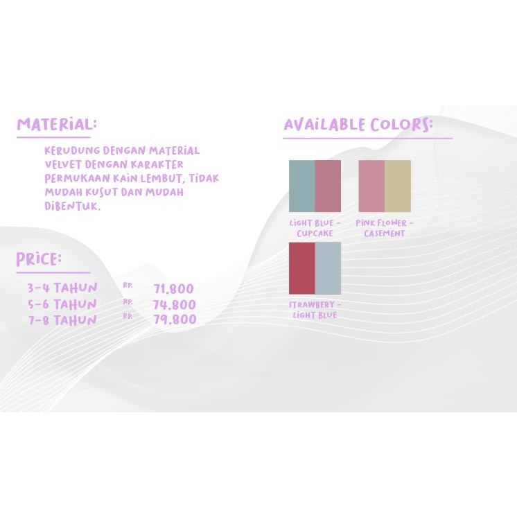 Produk ini memiliki 3 Variasi Size yaitu : 3-4 tahun,5-6 tahun,7-8 tahun,